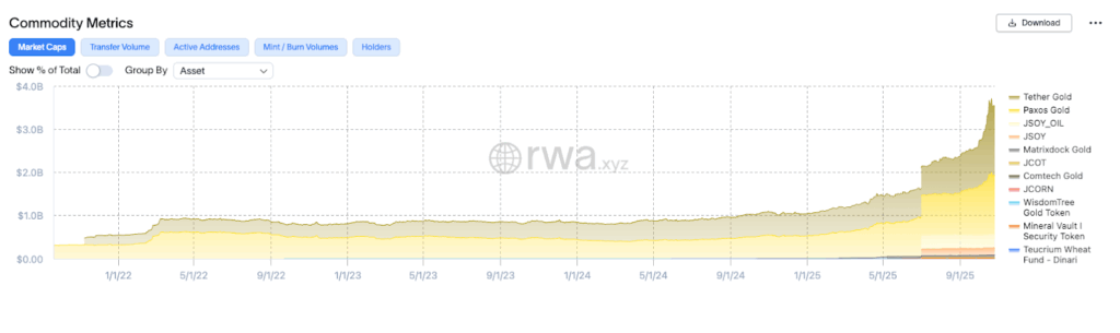 This represents less than 2% of the current stablecoin market, but almost a 4× increase since early 2025, when tokenised commodities totalled just over $1 billion. Some of that growth comes from gold’s 50% YTD price rise, but the broader trend is clear: investors are increasingly willing to own and manage commodities — especially gold — directly onchain.